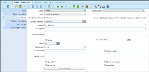 ColumnSQL: ColumnSQL is ADempiere and iDempiere’s way of adding a virtual column. You want to add a new entry with the following details: